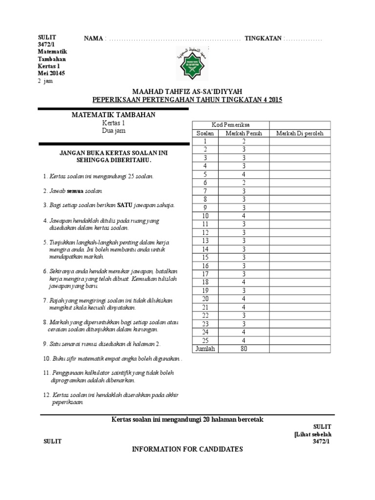 Related : Sejarah Statistik Matematik Tambahan - Calon wajib menduduki semua kertas peperiksaan bagi mata pelajaran yang didaftar..